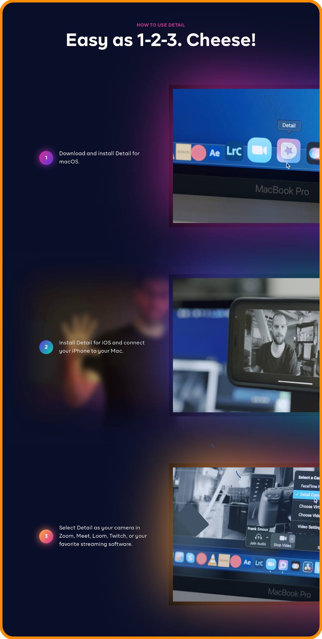 يتطلب تنظيم حلقة مباشرة عبر الانترنت احترام بعض الشروط الفنية، بدءا من الزاوية الصحيحة لتجنب صورة ضبابية أو صوت متقطع، بالإضافة إلى تجهيز المحتوى، و أيضًا التصوير بجودة مقبولة من كاميرا جهازك. يمكن اعتبار جودة الفيديو الخاصة بكاميرات الويب المدمجة سيئة ولا تعطي صورة جيدة. وكحل لذلك، يلجأ البعض إلى استغلال كاميرا هاتف iPhone لاجراء اجتماعات الفيديو بدلاً من ذلك. يتطلب استخدام جهاز iPhone الخاص بك ككاميرا ويب، تثبيت تطبيق مخصص لهذا الغرض على جهاز iPhone الخاص بك، بالإضافة إلى برنامج مصاحب على جهاز الكمبيوتر الشخصي. اليوم سنشارك معك Detail، وهو تطبيق يتيح لك استخدام جهاز iPhone الخاص بك ككاميرا ويب لجهاز Mac. والمفاجأة أنه يتكامل مع خدمات الدردشة المرئية الشهيرة التي ربما تستخدمها في العمل أو المدرسة، مثل Zoom و Twitch و غيرها. يقول بول Veugen وديفيد نوت مطوري البرنامج، أن الهدف هو تمكين أي شخص من إنشاء مقاطع فيديو احترافية دون الاستثمار في المعدات الجديدة أو قضاء ساعات في إتقان تحرير الفيديو. الغاية هو تحسين جودة إنتاج الفيديو مع تقليل الوقت اللازم لتحقيقه."