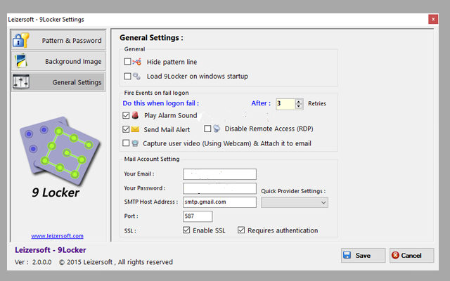 البرنامج يدعى 9Locker وهو برنامج مجاني وسهل الاستخدام حيث يسمح لك هذا البرنامج من استعمال النمط كقفل لحاسوبك، فكل ما عليك فعله هو تحميل البرنامج من هنا وتثبيته بعد ذلك ستقوم بفتح البرنامج سيطلب منك حينها التعديل على مجموعة من الاعدادات مثل هل تود ان يظهر النمط عند ادخاله وتفعيل خاصية الانذار بعد ادخال النمط بشكل خاطئ لعدة مرات حيث سيقوم البرنامج باصدار رنين او ارسال رسالة الى ايميلك.